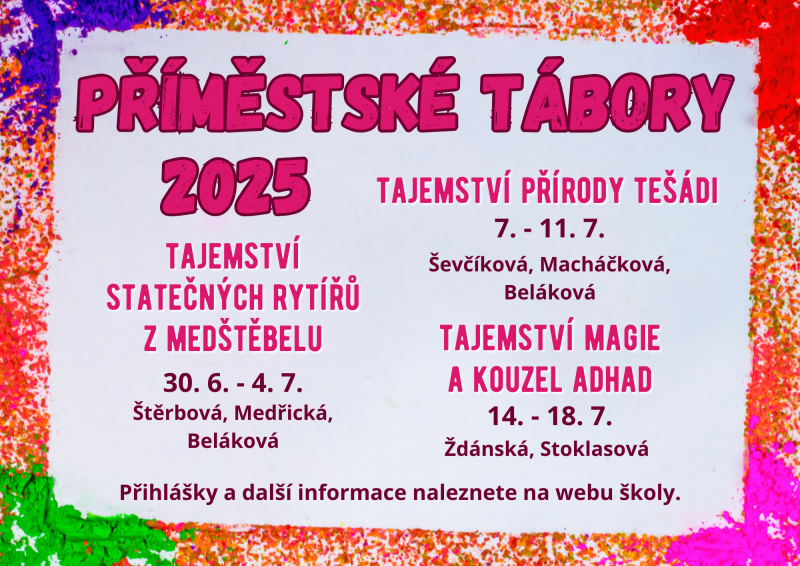 Příměstské tábory jsou pouze pro žáky naší základní školy. Každý tábor má maximální kapacitu 25 dětí.