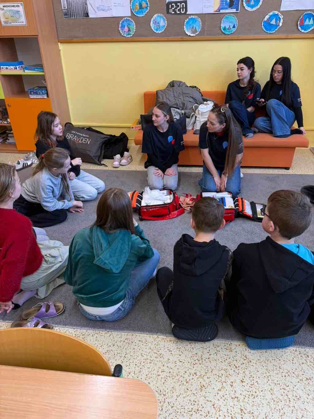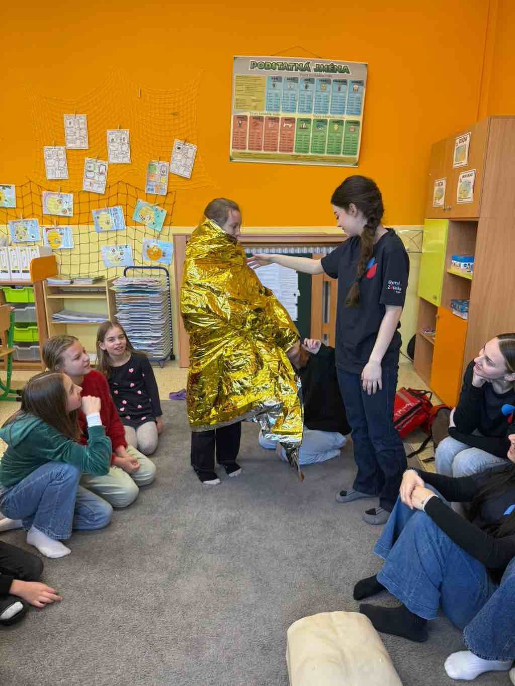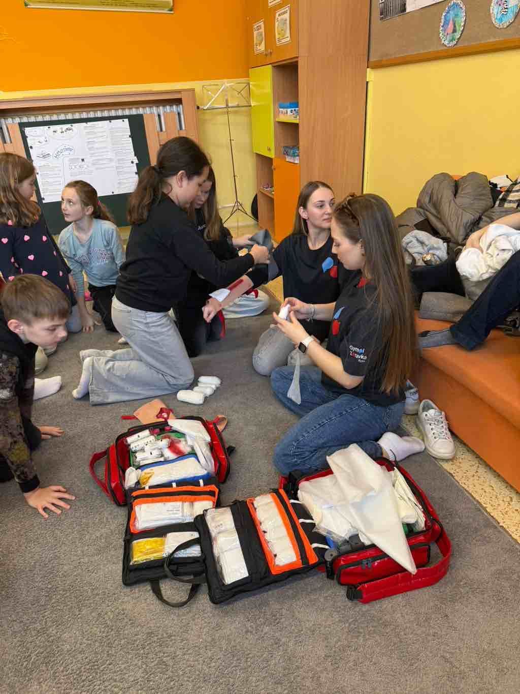 Studentky zdravotní školy dětem přiblížily resuscitaci, práci s obvazem, trojcípým šátkem i škrtidlem. Žáci si mohli všechny pomůcky prakticky vyzkoušet a aktivně se zapojovali. Policisté jejich snahu a spolupráci velmi kladně hodnotili.