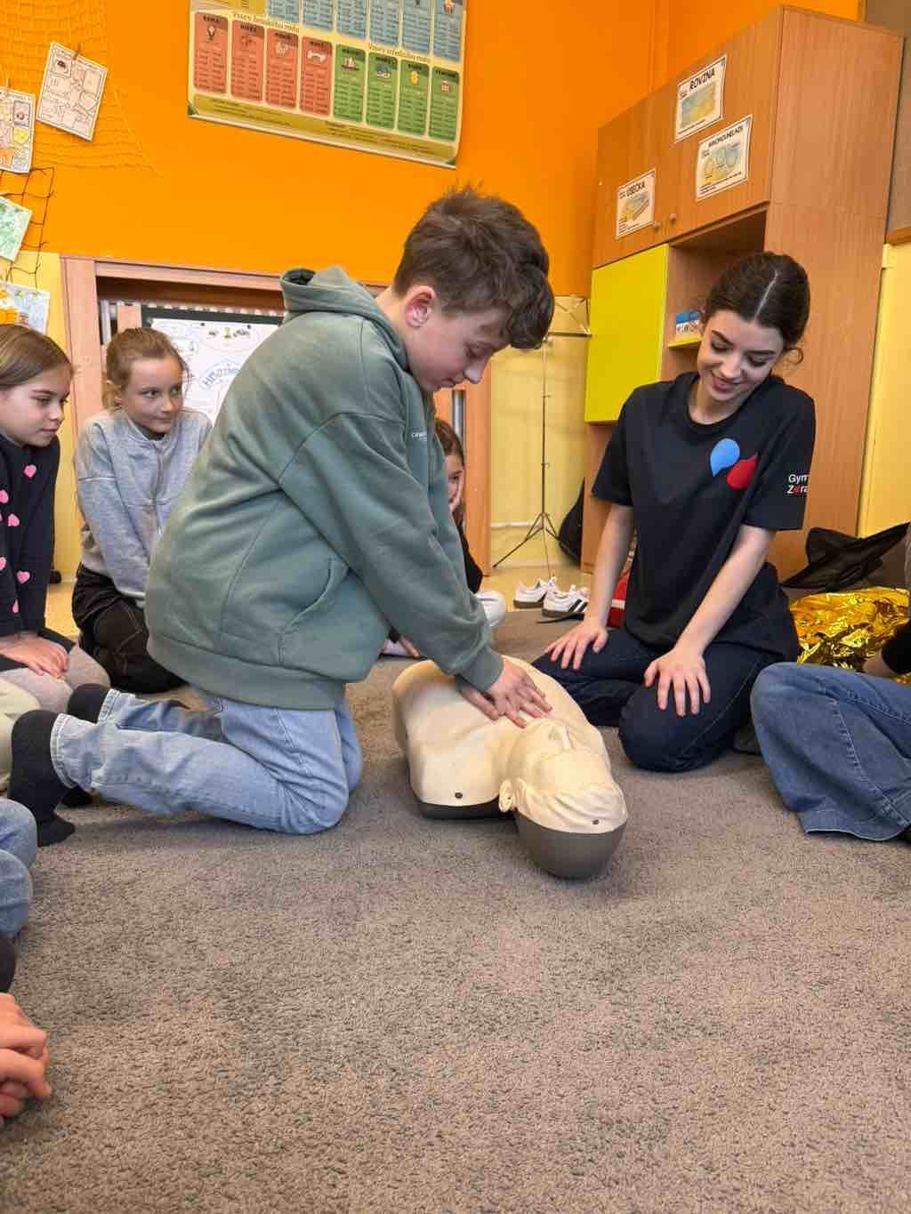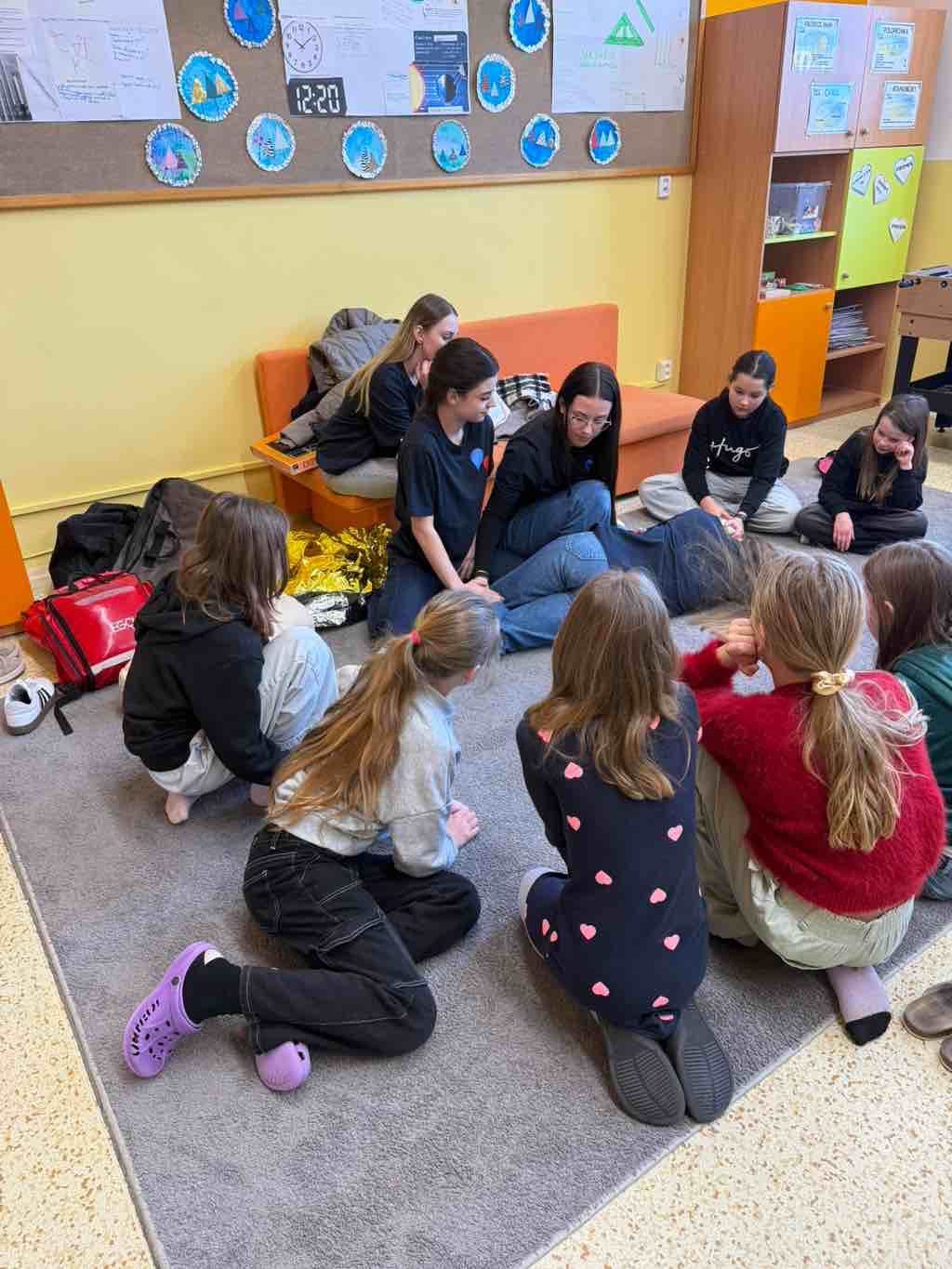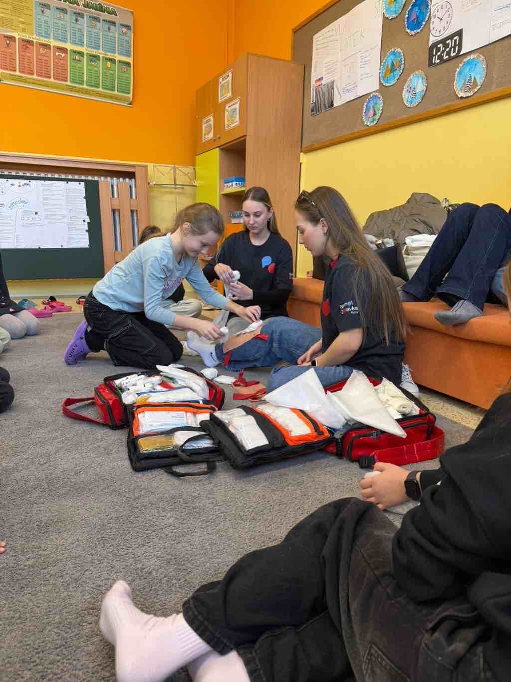 Studentky zdravotní školy dětem přiblížily resuscitaci, práci s obvazem, trojcípým šátkem i škrtidlem. Žáci si mohli všechny pomůcky prakticky vyzkoušet a aktivně se zapojovali. Policisté jejich snahu a spolupráci velmi kladně hodnotili.