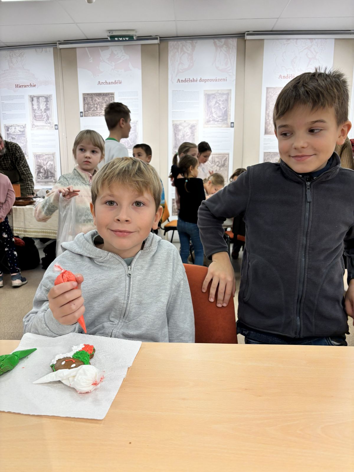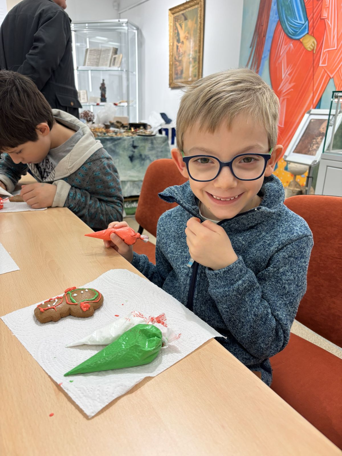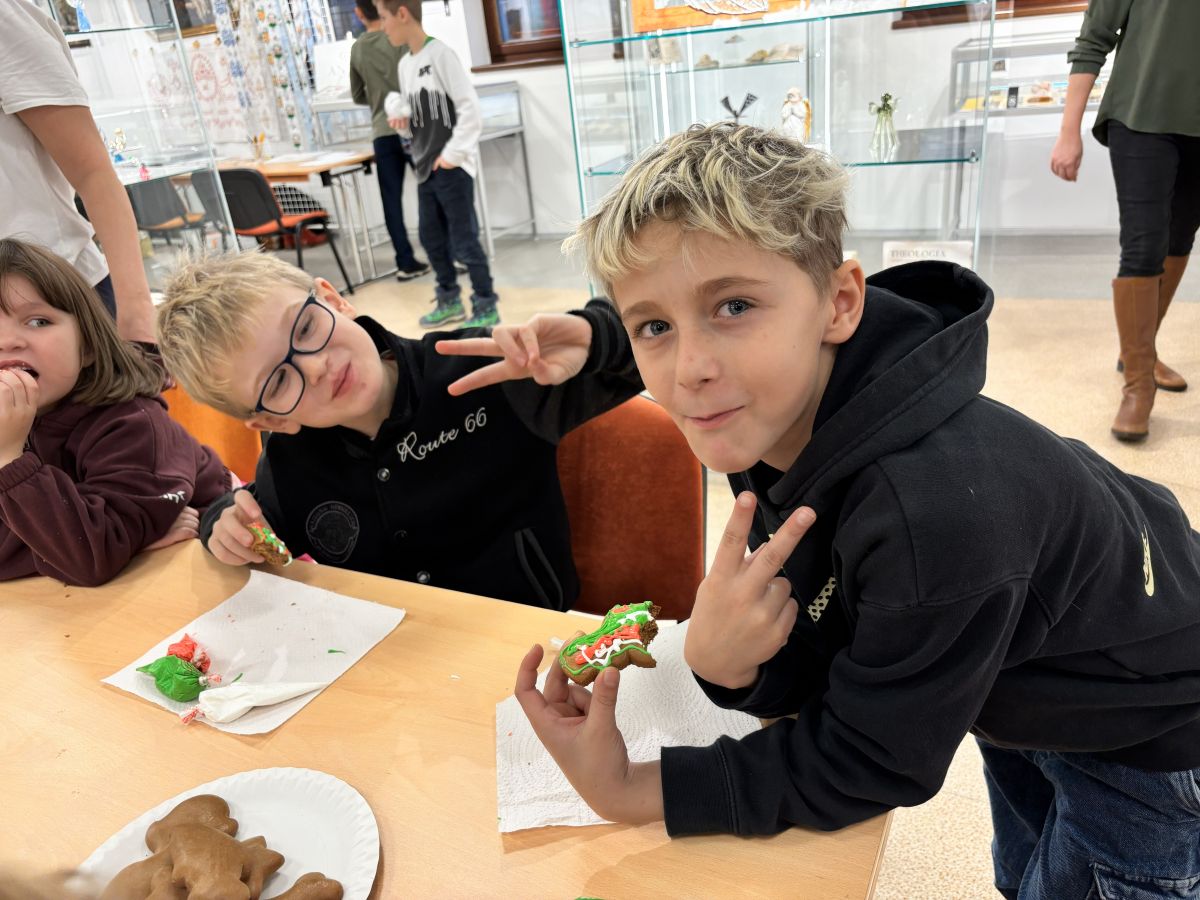 V rámci adventního času jsme se s dětmi vypravili do vlastivědného muzea v Kyjově, kde pro nás byl připraven program “Vánoce se blíží”. V dílničkách si děti malovaly keramiku, vyráběly vánoční ozdoby a zdobily perníčky, které si mohly odnést domů (nebo je hned sníst :) ). Velkým překvapením pro ně byla ukázka práce řezbáře, jehož dřevěné výrobky děti nadchly. Po skončení dílen se děti pustily do nakupování drobných vánočních dárečků, samy si počítaly peníze, domlouvaly se mezi sebou a zjišťovaly, co si ještě mohou dovolit koupit. Domů jsme se vraceli plní zážitků, vánoční nálady a s vlastnoručně vyrobenými dárečky.